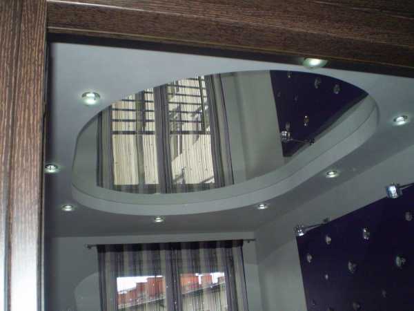 На натяжной потолок можно нанести любой рисунок, материал может быть разных цветов и фактур: зеркальной, матовой, имитации кожи. Блестящий потолок визуально увеличивает помещение и, кроме того, установленные в нем светильники прекрасно оживят интерьер. Дизайн натяжных потолков комнаты с зеркальным эффектом ниже: