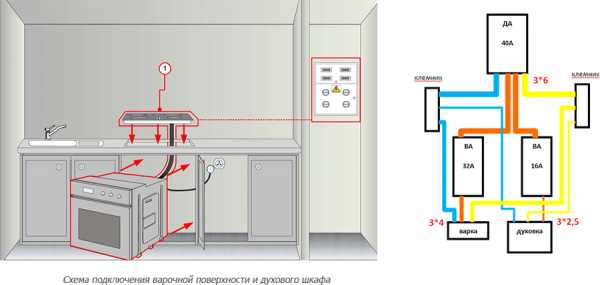 При подключении варочной поверхности или духового шкафа к электрическому щитку для каждого из этих электроприборов следует использовать одну линию, защищенную собственным автоматическим выключателем. При этом для потребителей с номинальным током 16 А используется автомат на 25 А, а для потребителей, номинальный ток которых составляет 32 А, — автомат на 40 А.