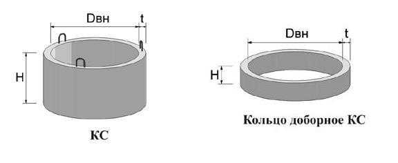 Именно эти размеры и являются основными для колодезных колец: Dвн – внутренний диаметр, t – толщина стенки, Н – высота элемента