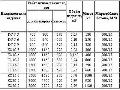 Масса одной конструкции зависит от ее габаритов и колеблется в диапазоне от 46 кг до 2300 кг. К примеру, если взять тот же КС 10-9, его вес равен 700 кг.
