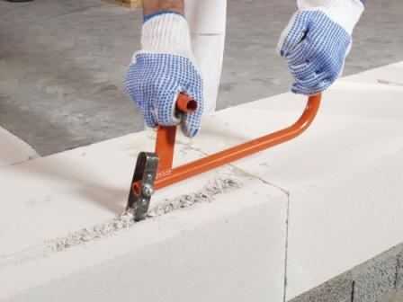 - Еще один небольшой совет: для резки блоков нужно использовать специальной ножовкой для пенобетона с крупными зубцами. При правильной резке вы избежите крошения материала.
