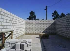 - после того, как основание наберет нужную прочность, наступает время кладки. Начинают ее с укладки рубероида между цоколем и первым рядом в качестве гидроизоляции.
