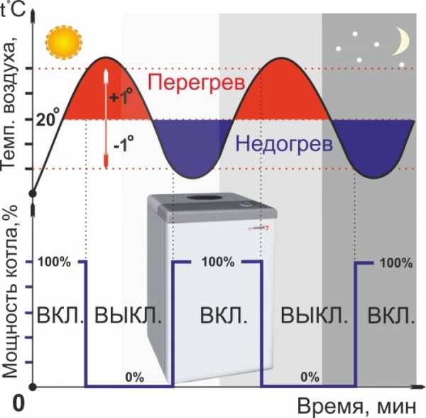 Сигнал на отключение поступает, если температура теплоносителя или окружающего воздуха поднимается выше заданного значения. Когда же она опускается ниже заданного уровня, то подаётся сигнал на включение отопительного оборудования.