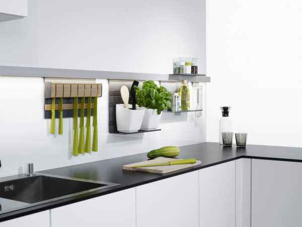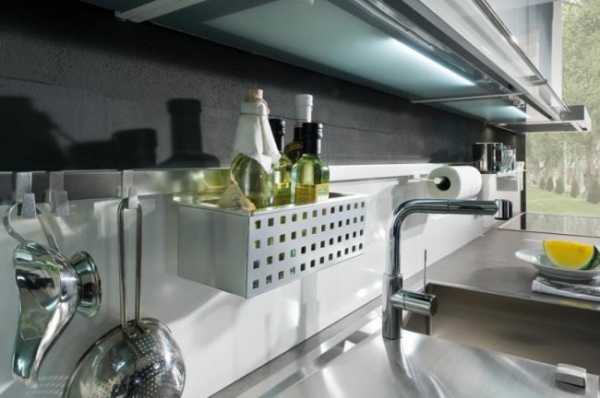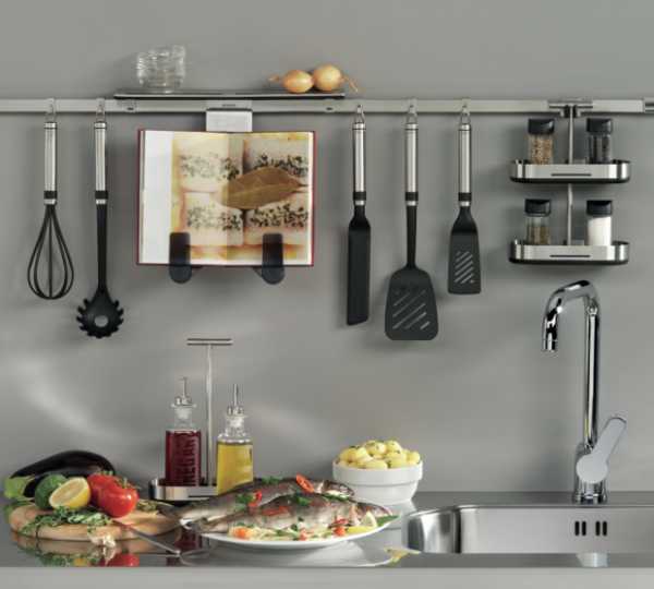 Существуют также разнообразные аксессуары для рейлингов на кухню, что в комплексе значительно облегчает труд. Для каждого предмета имеется свой контейнер, при этом Вам совершенно не понадобится суетиться и бегать по кухонному пространству.