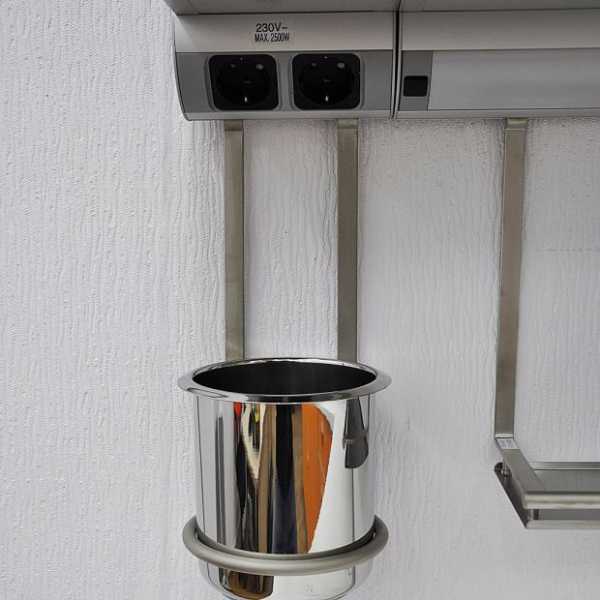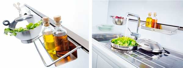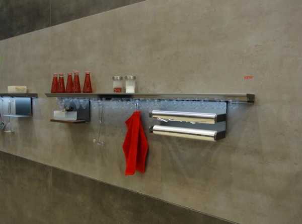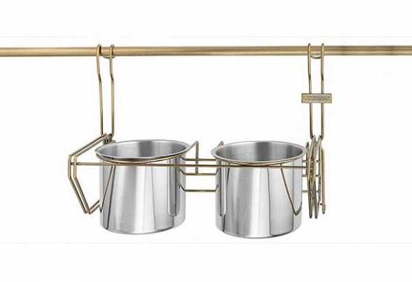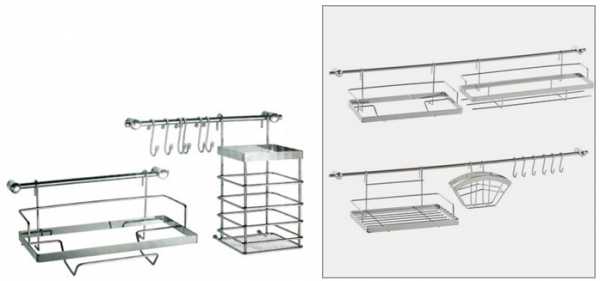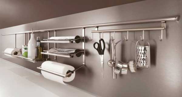 - Аксессуары для рейлингов на кухню из нержавейки дополняют навесные хлебницы, сушилки для тарелок, подставки для кастрюль, бутылок и бокалов, держатели для ножей.