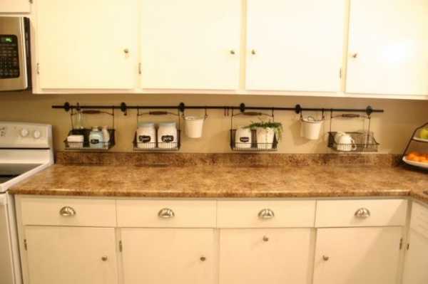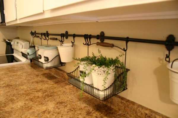 А вот потолочный вариант рейлинга поможет создать в кухне уют, в особенности с подвешенными корзинками, чесночными/луковыми связками.