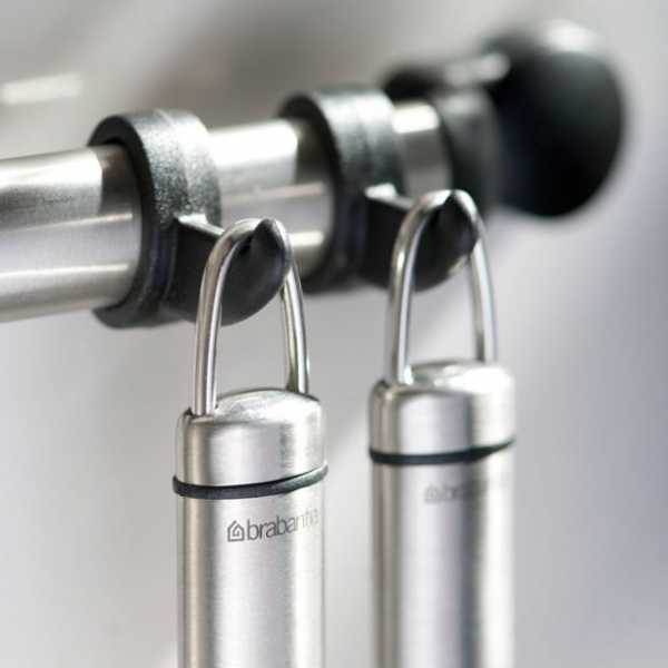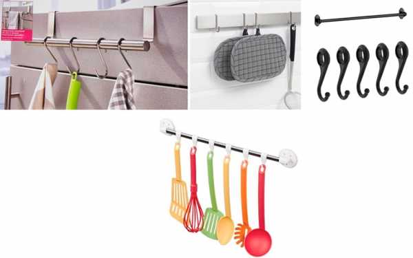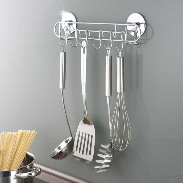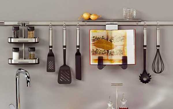 Рейлинги – чрезвычайно практичная система, устанавливаемая на стенах. Для повышения функциональности можно купить аксессуары, навешивающиеся на кухонные рейлинги, помогающие держать все нужные приборы под рукой. Существуют единичные вешалки разных размеров, или целые системы, включающие: