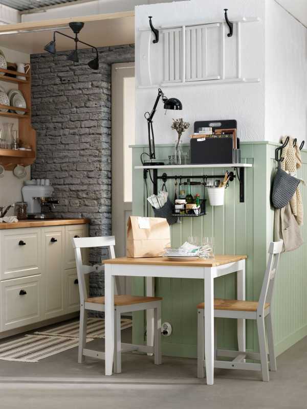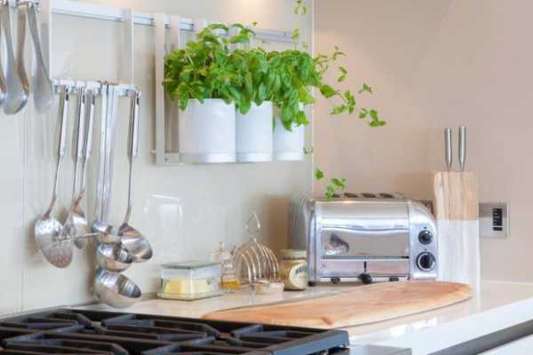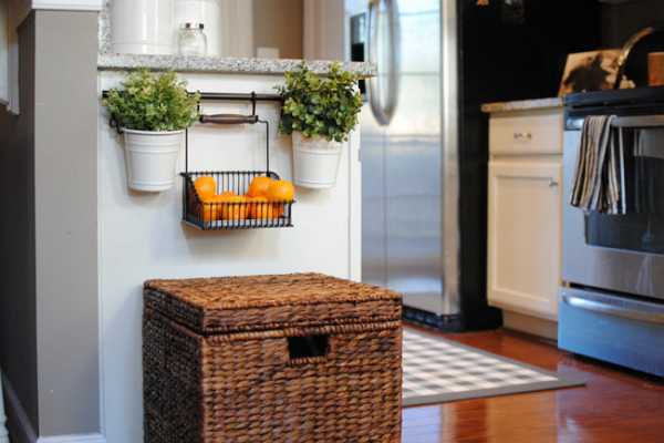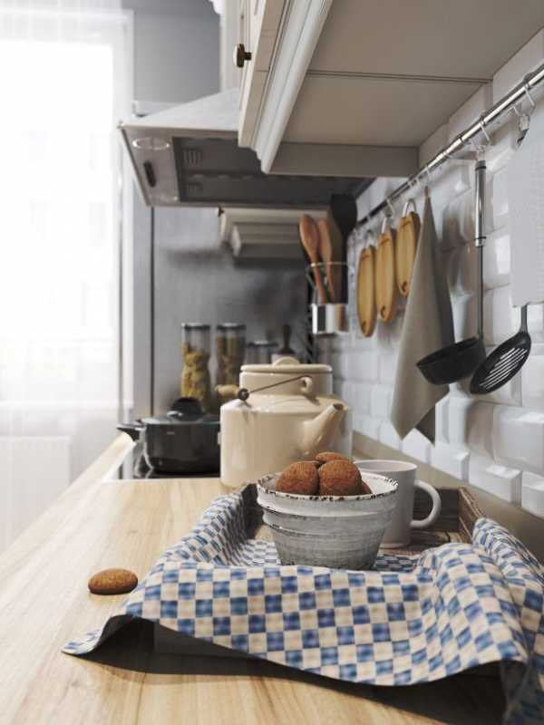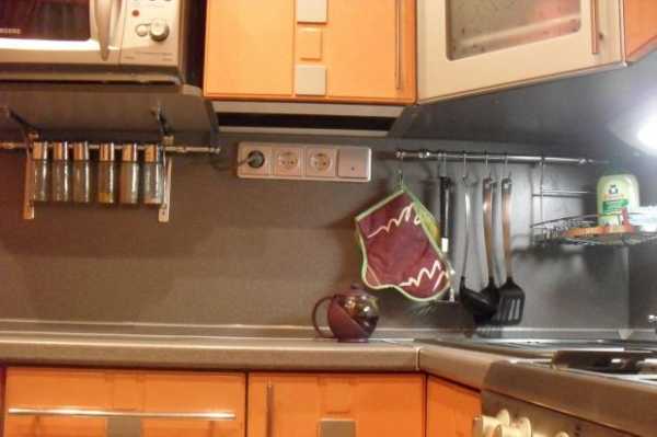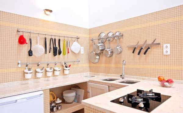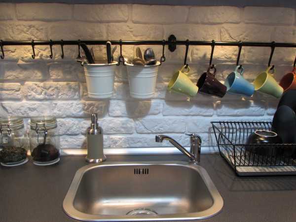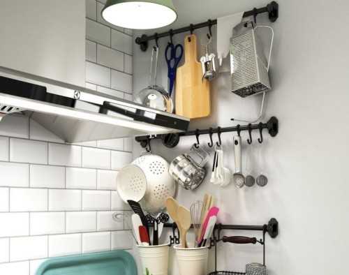 На маленькой кухне практично размещать рейлинговую систему по углам – так можно задействовать буквально каждый сантиметр полезной площади.