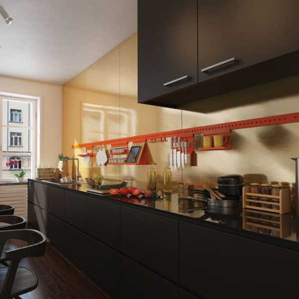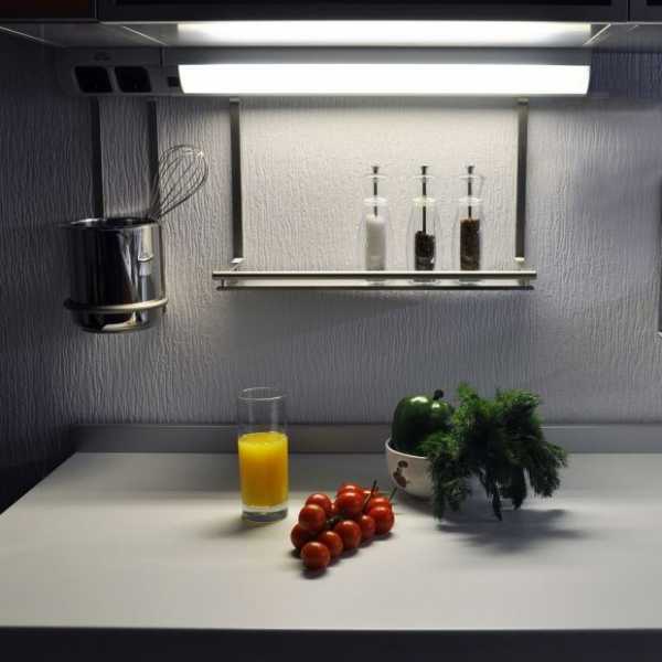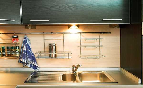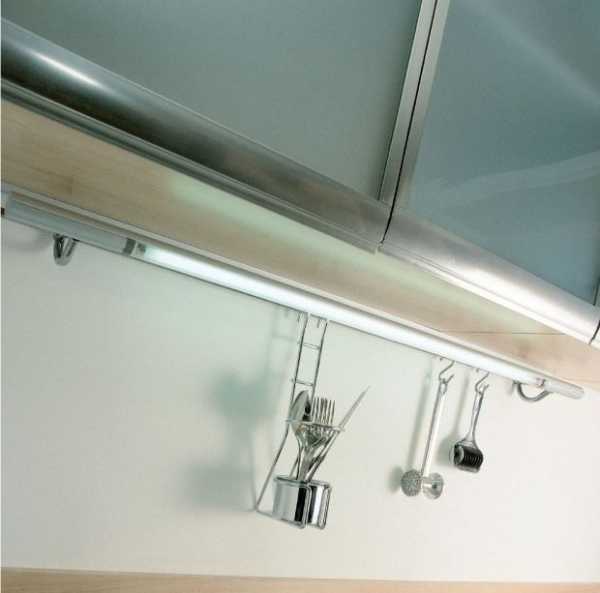 Возможно также организовать подсветку рейлинга, это повысит его практичность и украсит кухню. Данная особенность подчеркнет стиль модерн.