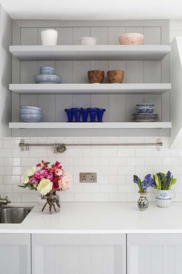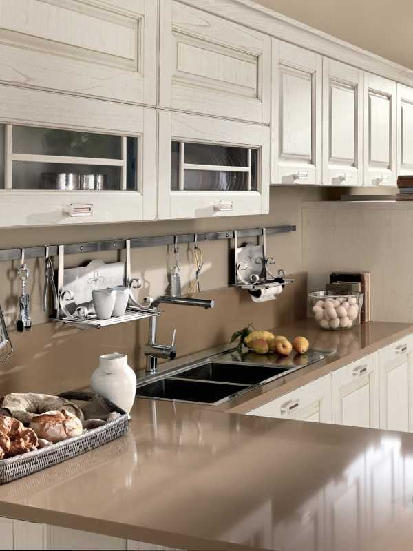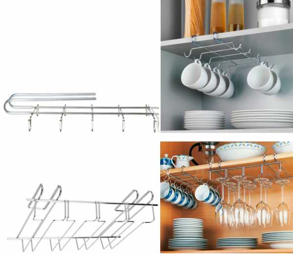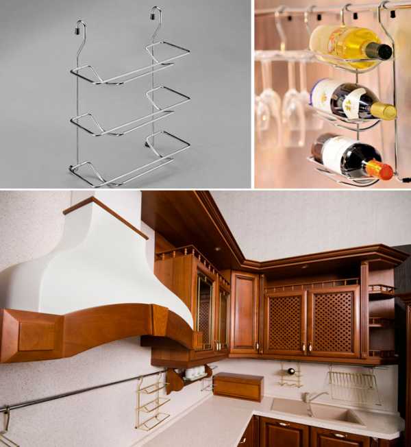 Нередко можно встретить приспособления, позволяющие разместить бокалы для вина. Обычно их крепят под навесными шкафами, иногда размещают в 2 ряда. Эти аксессуары не только служат практичным решением на кухне, где мало места в шкафах, но могут служить отличным украшением интерьера. Свисающие с полок бокалы, чашки выглядят удачным, декоративным решением.