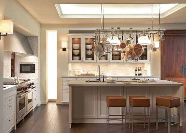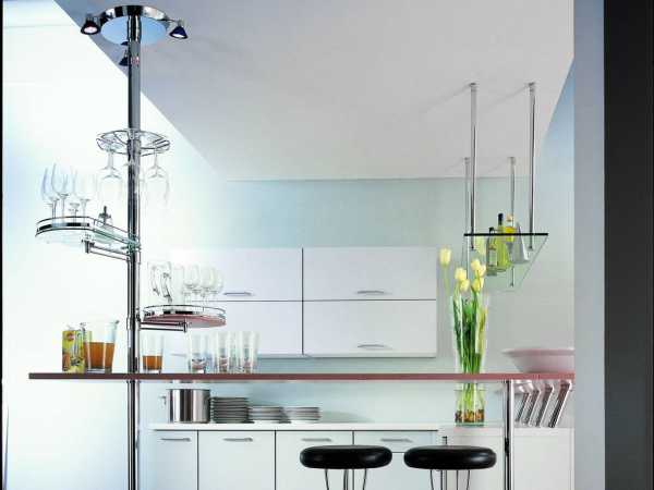 Что касается подвесных систем, такие варианты крепятся к потолку в области – над столешницей. Подобная система хранения может быть в кухнях с островком. На таких системах крепят утварь, бокалы, чашки и т.п.
