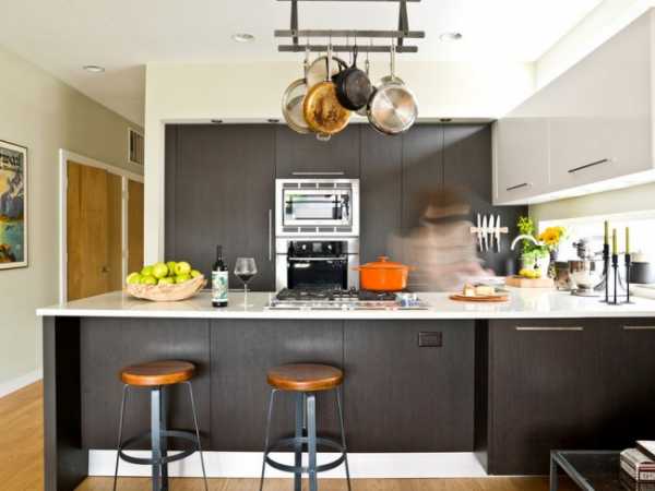 Для тех, у кого кухня с «островком», лучше использовать рейлинги, крепеж которых осуществляется к потолку.