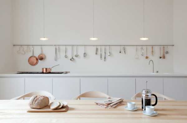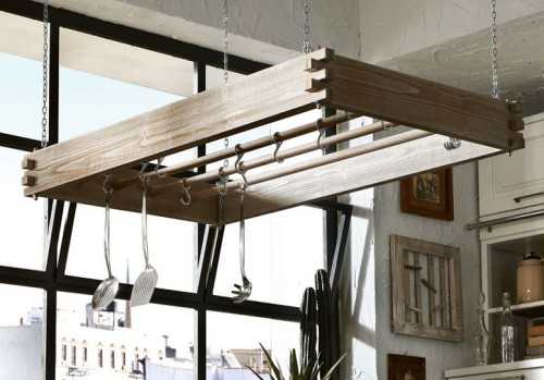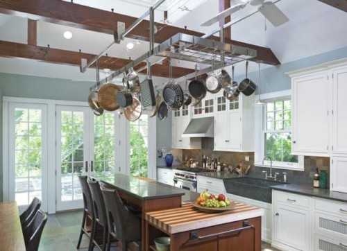 Если вы решили подвесить тяжелые сковородки и кастрюли, то обязательно позаботьтесь об их внешнем виде. Не только внутренняя, но и наружная поверхности должны быть в идеальном состоянии. В противном случае демонстрируя окружающим днища кухонной утвари со следами гари и жира, вы испортите впечатление даже о самой изысканной и дорогой кухне.