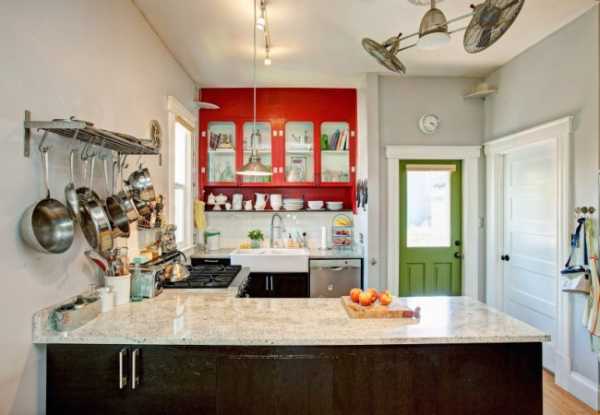 - Развешенную на крючках для рейлинга на кухню посуду целесообразно использовать в помещениях, выполненных в итальянском и прованс стилях. Добиться отсутствия подвесных шкафов в рабочей зоне поможет только хорошо продуманная система открытых полочек и рейлингов.