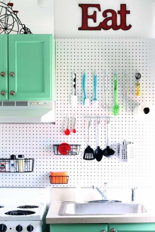 Не стоит вешать половники, шумовки и прочие поварежки у плиты, они будут забрызганы каплями жира. Лучше расположить их у рабочей поверхности.