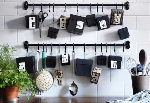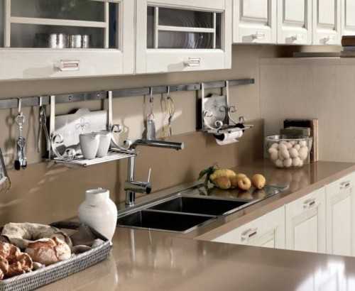 Эстетичность и функциональность систем основывается на наличии подвесных аксессуаров: баночки для специй, крючки для полотенец и прочее держатели для кухонных принадлежностей. В основном крепят рейлинги под навесными шкафами, но возможны неординарные варианты у столешницы или над кухонным островом. Их местонахождение полностью зависит от вкуса и удобства владельца кухни.