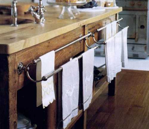 - Современным стилевым решением станет использование на рейлингах разноцветных прихваток или красивых салфеток.
