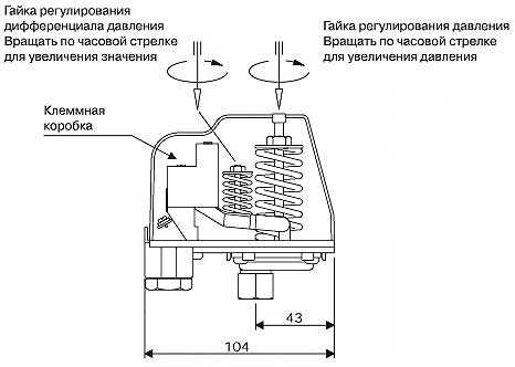 Регулировка реле давления. (Для увеличения нажмите)Как правило, реле, входящее в комплект станции, имеет заводские настройки, заранее подготовленные под определённые условия.