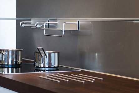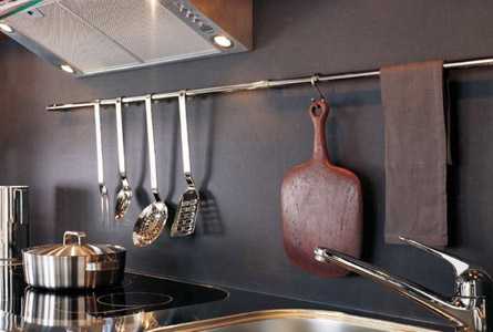 - Порядок в невесомости. Благодаря применению рейлинговых систем можно не только упорядоченно расположить весь кухонный инструментарий, но и полностью освободить рабочую поверхность, что сделает пребывание на кухне более комфортным.