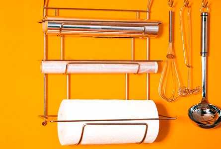 На рейлингах располагают различные кухонные аксессуары, ложки, контейнеры со специями, цветы, полотенца и другую утварь, используемую на кухне.