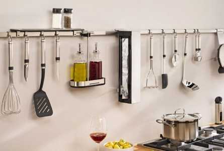 Так вот уникальность этой системы заключается не только в том, что ее можно установить в удобном лично для вас месте и разместить на ней все самое необходимое. Производители навесных элементов не поскупились в своих идеях, создав бесчисленное множество практичных дополнений к простой рейке. В их числе сушилки для посуды, различные полочки для специй и других емкостей, специальные держатели для бумажных полотенец, фольги и пищевой пленки, подставки для столовых приборов, фруктовницы и даже держатели для книг с рецептами.