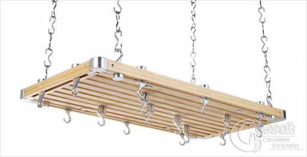 Рейлинги вертикального типаА подвесные рейлинги для кухни вешают над столом либо другой поверхностью, а это означает, что они крепятся к потолку. Здесь может быть использована только 1 труба (длина − 30−50 см) или можно подвесить и всю рейлинговую систему для удобства размещения большей части кухонной утвари.