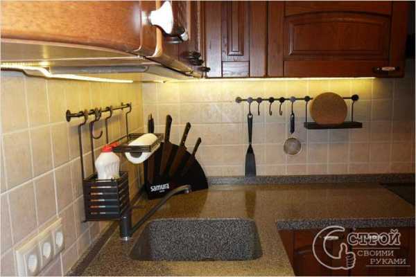 - Всегда под рукой. С рейлингами вся необходимая кухонная утварь будет на виду, а главное – на расстоянии вытянутой руки. Исчезнет необходимость в процессе готовки метаться по кухне и судорожно открывать-закрывать дверцы шкафчиков в поиске внезапно понадобившегося венчика или перечницы.