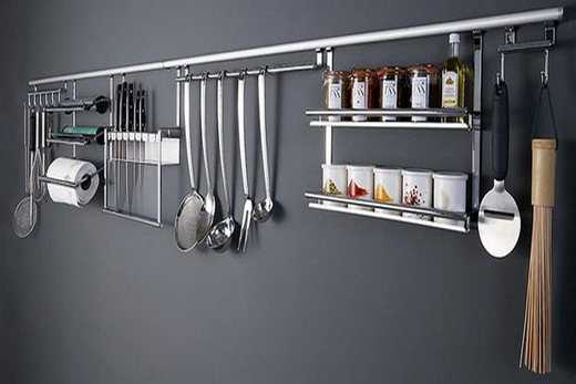 На кухне есть множество полочек и приспособлений, баночек с сыпучими продуктами. Как удобно расположить их вместе с кухонной утварью? Ответ — при помощи современной системы рейлингов для кухни (хром, бронза и пр.).