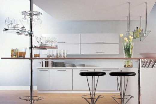 Кухня с подвесными рейлингамиА если кухня выполнена в стиле минимализм, то подобные изделия лучше не использовать. Поскольку кухне с таким интерьером необходимо минимум внимания к деталям, а с применением рейлингов подобного эффекта будет нелегко добиться.