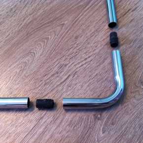 Так как, в нашем примере выполняется стыковка боковых отрезков рейлинга с угловым переходником – вставьте с обеих сторон уголка пластиковые вкладыши заглушек (приобретаются дополнительно). Вкладыши устанавливаются в трубку примерно наполовину. Для обеспечения более плотной фиксации вкладышей в трубке, можно применить клей-герметик.