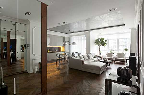 Разделить пространство помогут многоуровневые натяжные потолки. Для этого нужно опустить уровень потолка над одной частью и поднять над другой. В переход уровня установите точечные светильники, чтобы разделить их между собой светом. Глянцевая поверхность натяжного потолка зрительно сделает комнату больше. Наглядно это показано на фото.