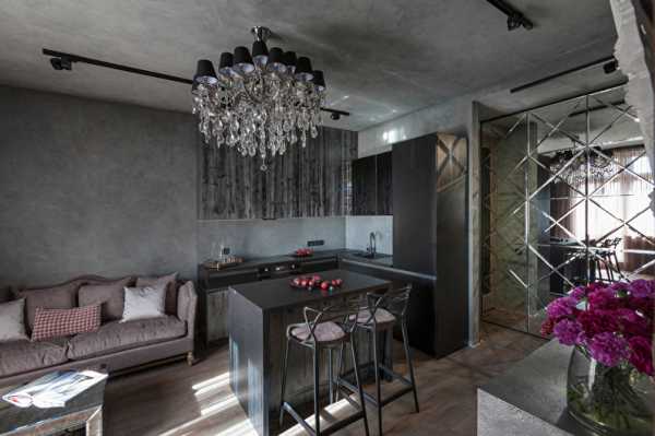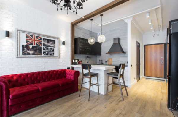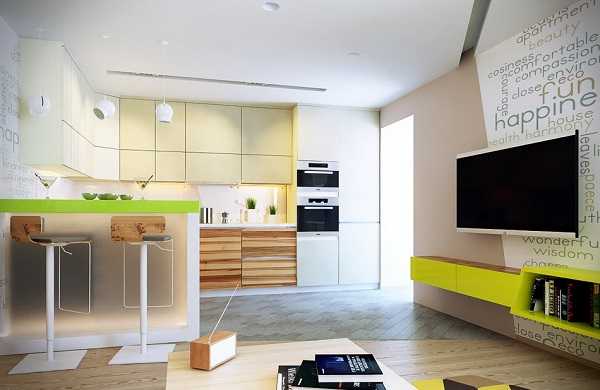 В такой квартире совмещенная кухня – не просто один из вариантов дизайна, а абсолютная необходимость. Кроме того, здесь же обычно размещают и спальню, используя как спальное место диван, или встроенные откидные кровати.