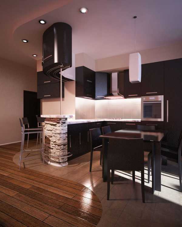 - разноуровневый пол – для этого немного приподнимается кухонная зона, что выглядит очень стильно.