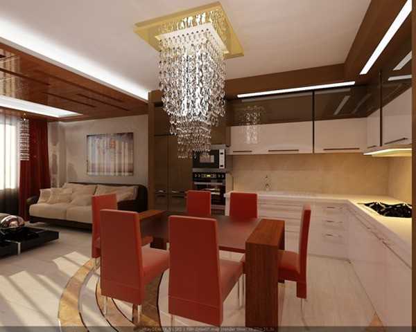В классическом варианте в дизайне используйте хрустальные люстры, точечные светильники. В современном интерьере квартиры или в доме гораздо больше вариаций для применения осветительных приборов, фото которых вы здесь увидите. Не переборщите с деталями дизайна и контрастами, чтобы кухня гостиная не выглядели вульгарно.
