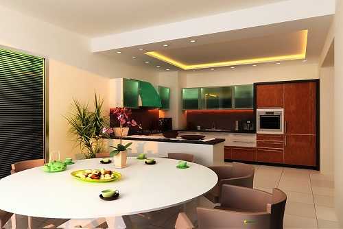 Этот прием уместен только в квартирах, где потолок достаточно высокий. Создание разноуровневого пола в кухне-гостиной – эстетичное и прагматичное решение. Под приподнятым кухонным полом можно спрятать многочисленные коммуникации. С помощью незначительного возвышения можно отделить и зону столовой. - С помощью потолка.