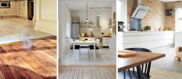 Варианты сочетания напольного покрытия для зонирования в кухне гостиной: