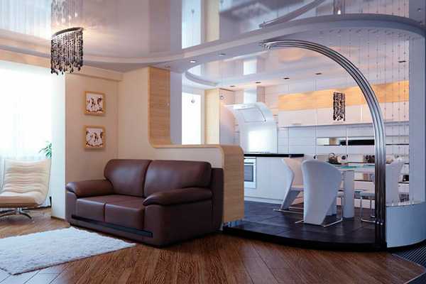 Зонирование с помощью подиумаДля визуального разделения пространства также можно использовать шторы, раздвижные системы, другие элементы декора, воплотивших ваши идеи. Помимо барной стойки, можно применить фальш-стену, текстильную ширму, многоуровневые конструкции. Большая площадь позволит поставить обеденный стол, за которым будет удобно собираться большой семье и гостям.
