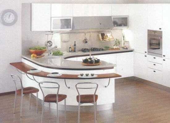 Огромное значение имеет обстановка в кухне. В небольших квартирах лучше устанавливать ее Г-образно или в один ряд. Если же свободное место в избытке – можно позволить себе П-образное размещение, расстановку в два ряда, или создание кухонного островка.
