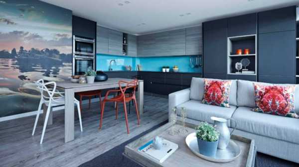 Здесь все предельно просто: на кухне – плитка или ламинат, в гостиной – ковер или паркет, или на кухне – пластиковые панели, в зале – обои или декоративная штукатурка. Это не только визуально разграничит пространство, но и будет достаточно практично, так как на отделочные материалы кухни постоянно воздействуют влага, жир и моющие средства. - С помощью мебели.