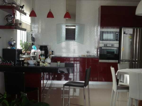 Смелые и активные выбирают интерьер в стиле хай-тек, поскольку он оригинален и многогранен. Дизайн в этом стиле характерен современными элементами, контрастными цветами, уникальными формами. Чтобы подчеркнуть стиль, купите для обеденной зоны стулья и лампы ярких цветов – салатового, красного, желтого. Дополните образ стеклянной прозрачной столешницей, которая будет идеально гармонировать с глянцевым металлом фурнитуры кухонного гарнитура. Вся техника должна быть инновационная, и выполненная в оригинальных формах.