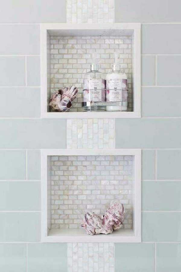 Форма ванны будет во многом зависеть от самого помещения и может быть как угловой, так и стандартной. Хранить различные моющие и чистящие принадлежности можно в оборудованной нише под ванной, тумбочка под рукомойником станет хранилищем косметики, полотенец и пр. Для средств гигиены, использующихся ежедневно хорошо подойдет небольшая подвесная стеклянная полочка над раковиной.