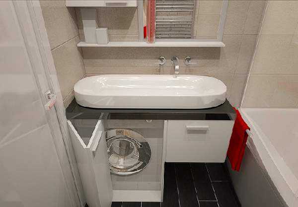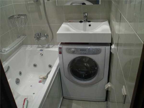 - Что касается стиральной машины, то ее по возможности перенесите на кухню. Если такой вариант нельзя воплотить в жизнь, тогда ориентируйтесь на небольшие машинки, которые поместятся, к примеру, под умывальником. Допускается и подвесной вариант монтажа над тем же унитазом. Но тут очень внимательно подойдите к вопросу безопасной установки.