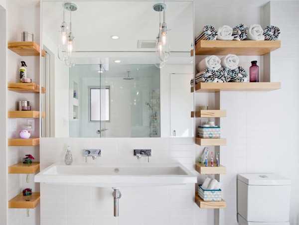 - Желая расширить функциональность помещения, позаботьтесь об установке шкафчиков и полочек. Все это обязательно навесное, а не напольное. В идеале — угловая мебель, что позволит задействовать все свободное пространство;