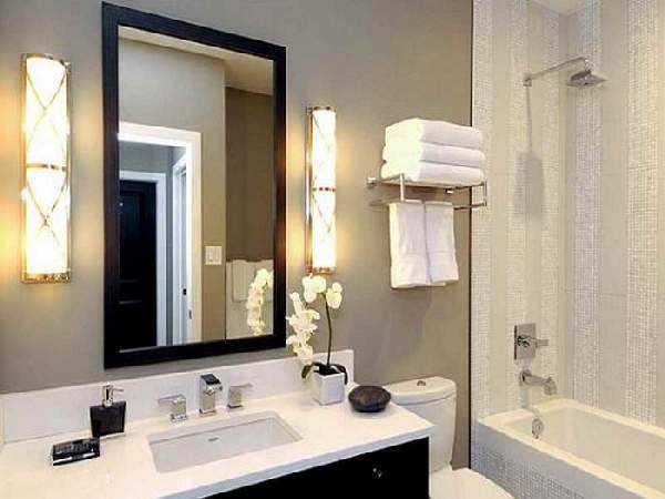 - Расположите над умывальником большое зеркало с подсветкой. Помимо декоративного эффекта, оно принесет вам практическую пользу. Не ограничивайтесь одной лампочкой в центре комнаты.