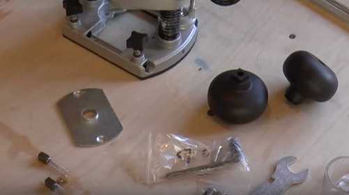 Продается в добротной картонной коробке, что хорошо для хранения , пока не сделаете или купите специальный ящик. Есть две пластиковые круглые ручки, быстро и жестко монтируются на винты. Ключ рожковый для смены фрез, копировальное кольцо. Две запасные угольные электро щетки, шестигранник, два цанговых зажима 6 и 8 мм, набор из прозрачного пластика для пылеудаления, боковой упор.