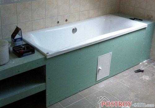 Для изготовления такого экрана следует использовать специальный гипсокартон, который предназначен для помещений с повышенным уровнем влажности.