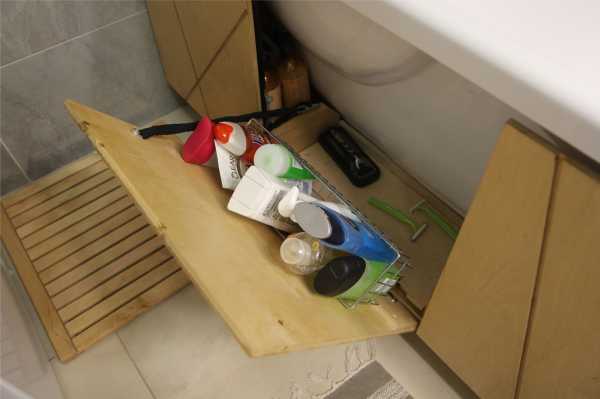 - Можно добавить выдвижную полочку на магнитах. Она пригодится для хранения различных мелочей, которыми мы пользуемся в ванной комнате: расчески, шампуни, пенки для ванны и другим.