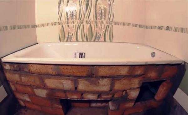В этом варианте все просто. По границе ванны или же от стенки до стенки, возле которой стоит ванна, возводится кирпичная стенка толщиной в полкирпича. Обязательно, как и при возведении обычной стены, кирпич перешивается, то есть каждый следующий ряд смещается на полкирпича. В месте удобном для доступа к сливу ванны формируется окошко. Для того чтобы его прикрыть, достаточно купить или изготовить дверцу и прикрепить на навесы.