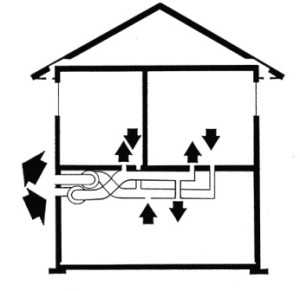 Эта разновидность обеспечивает несколько более эффективный воздухообмен в помещениях дома. В данном случае неплохое проветривание можно устроить во всех комнатах. К тому же, движутся потоки из-за работы вентилятора гораздо быстрее. В монтаже подобные системы также максимально просты, а их установка обходится недорого. Их недостатком считается прежде всего большие теплопотери в зимний период времени.