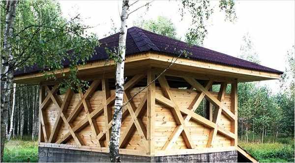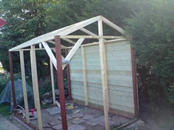 Если передние стойки сделать более высокими, то можно обойтись и без них. В этом случае крыша получится односкатная. Ее соорудить проще.